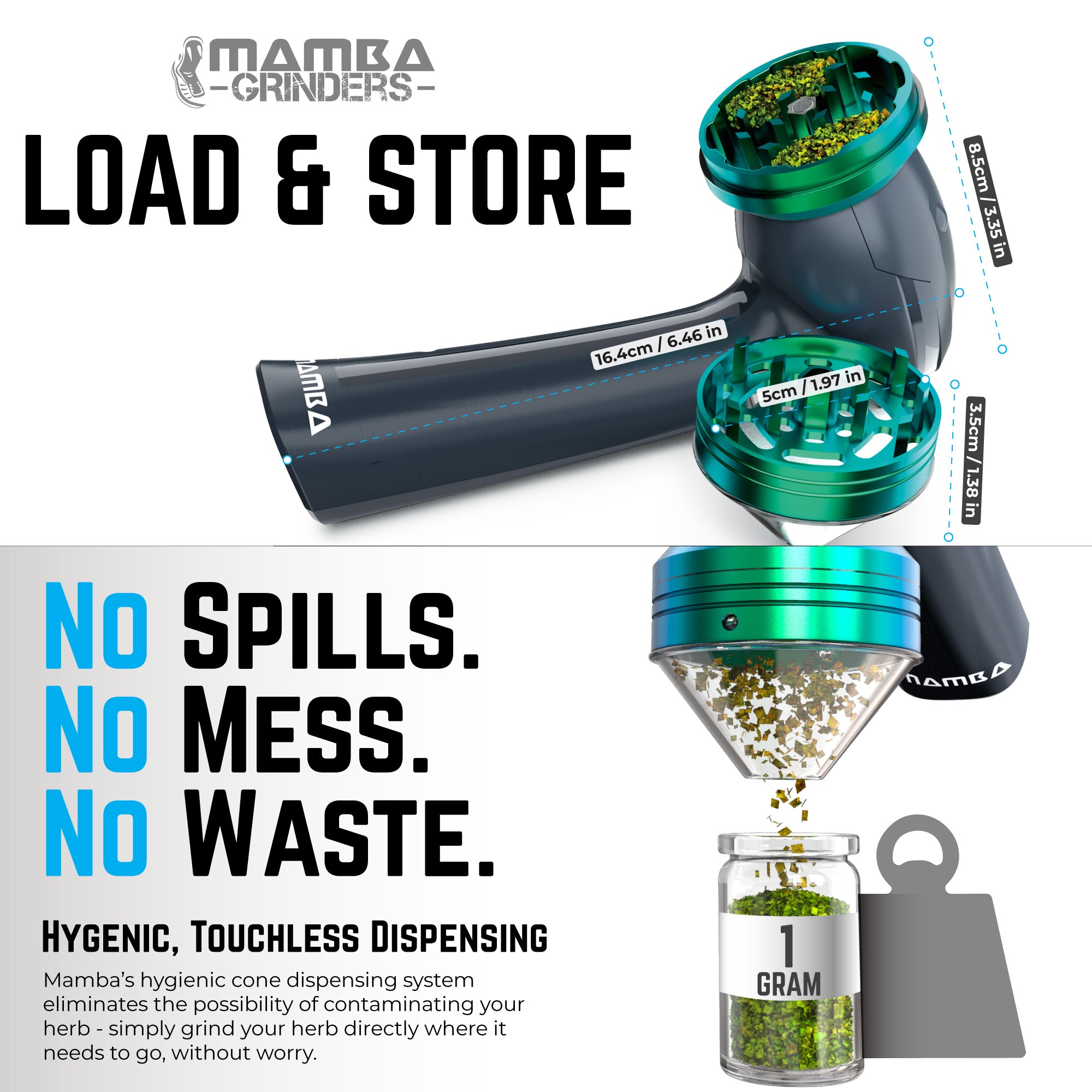 The Mamba grinder's cone-shaped head dispenses your herb accurately and hygienically. Enjoy a touchless experience with your herb; one that preserves the integrity of your herb and never damages it.