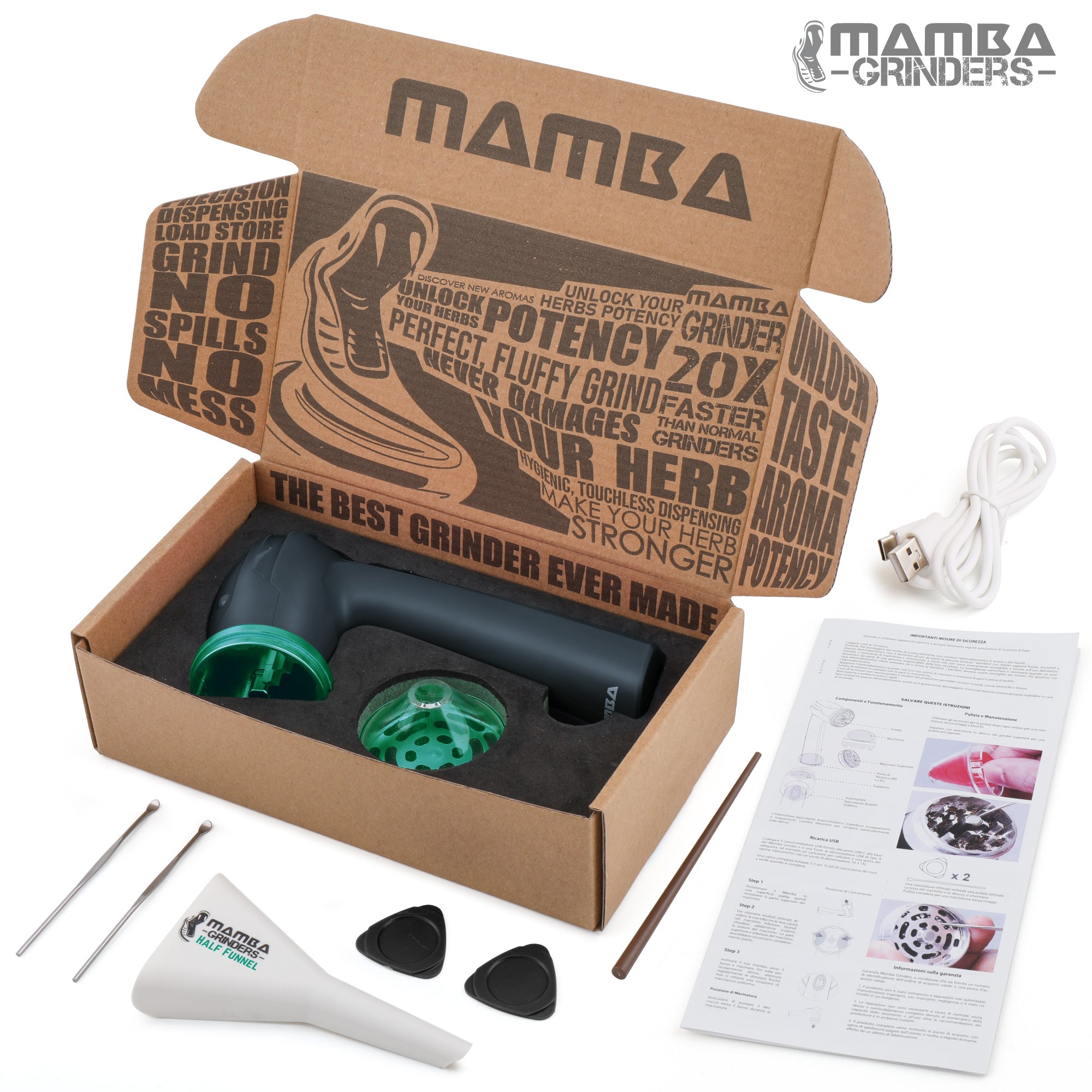 Typical grinders either grind your herbs so fine that it restricts airflow, or shreds it so thick that it's clumpy. The Mamba electric grinder doesn't just grind your herbs, it breaks up clumps and fluffs it to the perfect consistency. Mamba unlocks the hidden tastes, aromas & potency within your herb that other grinders are incapable of doing.